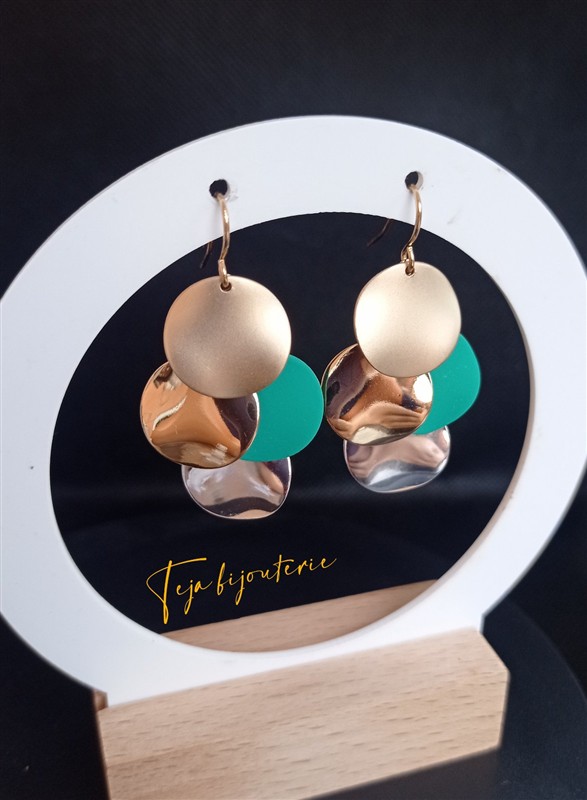 Unikatne i efektne, ove naušnice napravljene su od više kružnih elemenata u zlatnoj, zelenoj i metalik nijansi, što im daje moderan i atraktivan izgled. Njihov dinamičan dizajn unosi dozu glamura i razigranosti u svaki outfit.